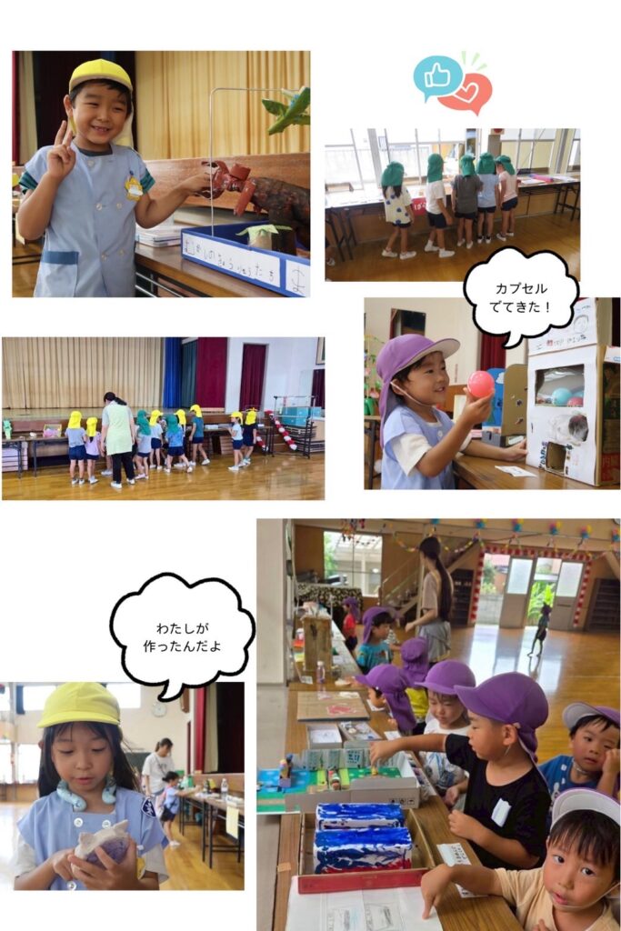 先生の手をひき、「これ見て〜」と、頑張ったところや見て欲しいポイントなどを興奮気味でお話しする子どもたち。一生懸命作った作品をみんなに褒めてもらって、きらきらと誇らしげなお顔が印象的でした。