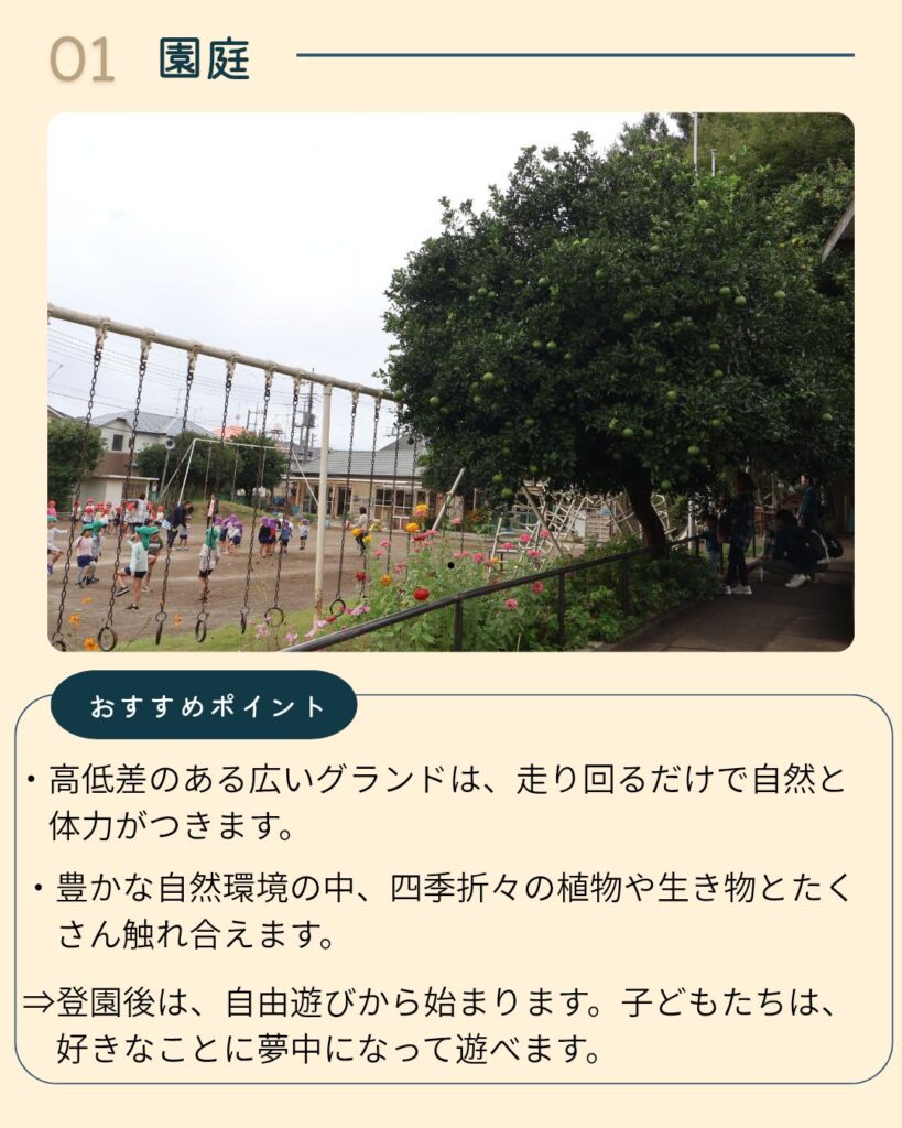 実際に訪れてみると、大きな木があり、生き物たちに囲まれ、広い園庭で走り回る子どもたちは、とても元気いっぱいですごく楽しそうで、我が子もここで過ごせるといいなと思いました。