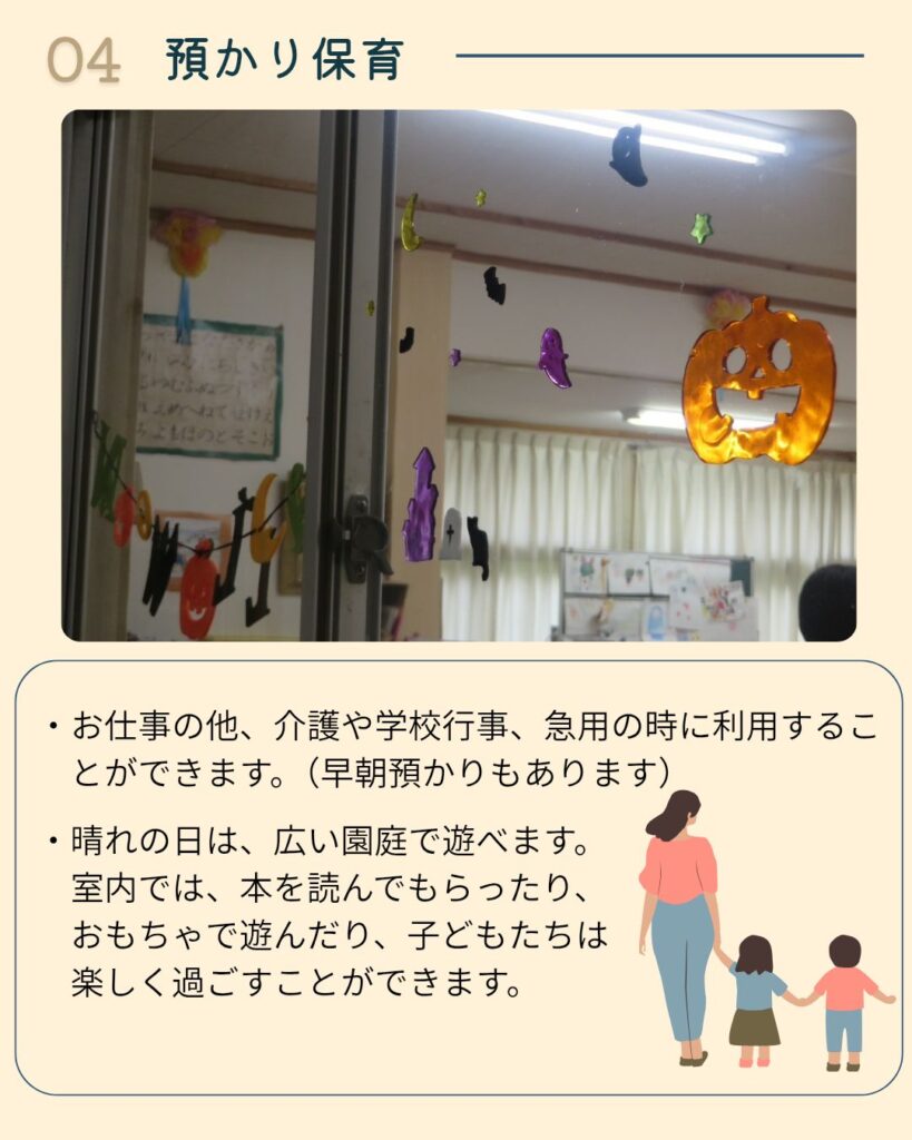 子どもが幼稚園に行っている間に働くお母さんが増えてきました。働いている方は勿論ですが、上の子どもの面談などの時に利用させてもらい、とても助かりました。