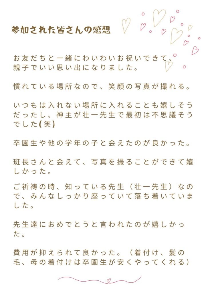 大好きな先生やお友達たちと一緒にお祝いができる《特別な七五三》。神社がある幼稚園ならではですね。
