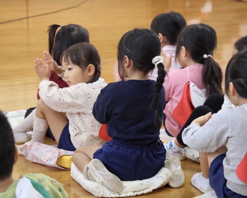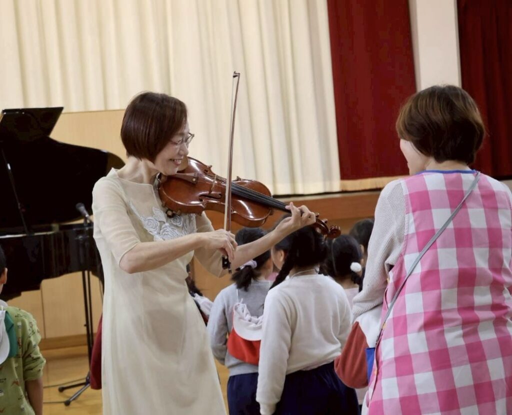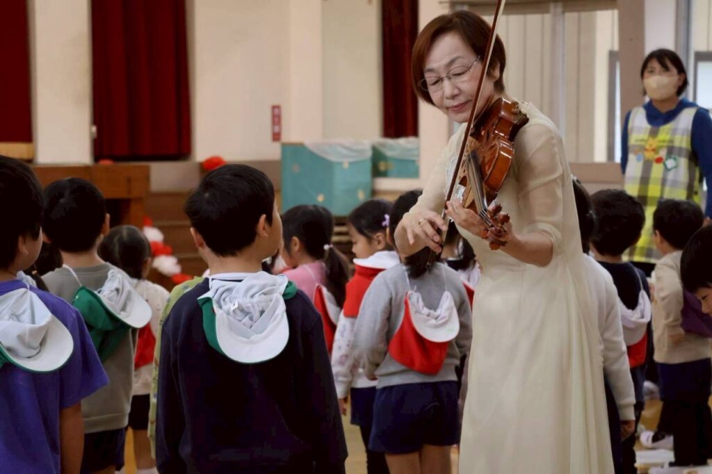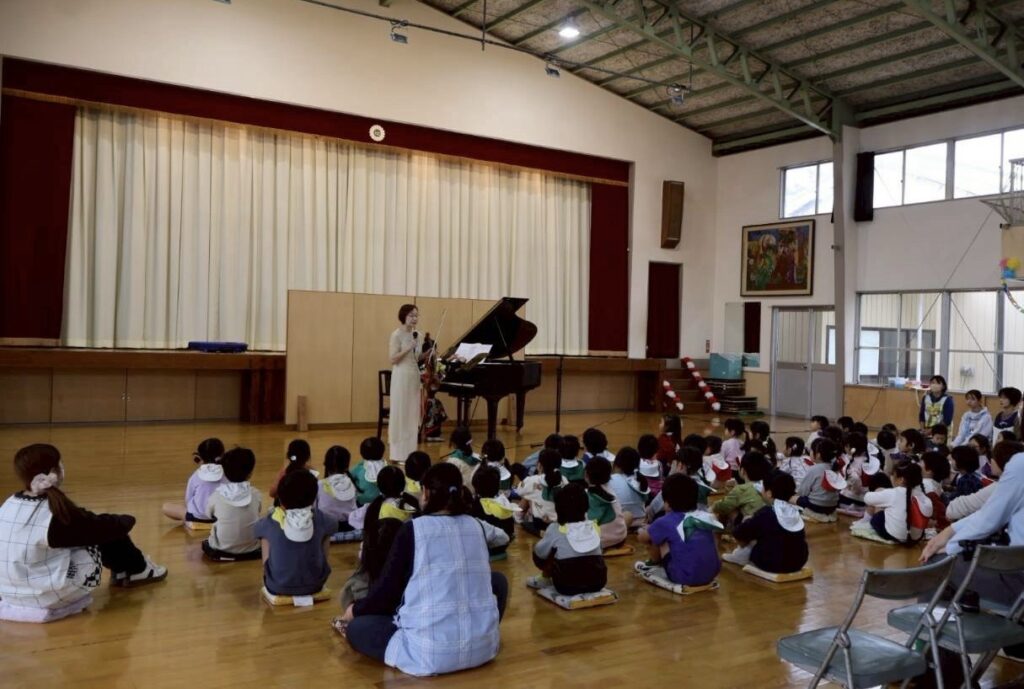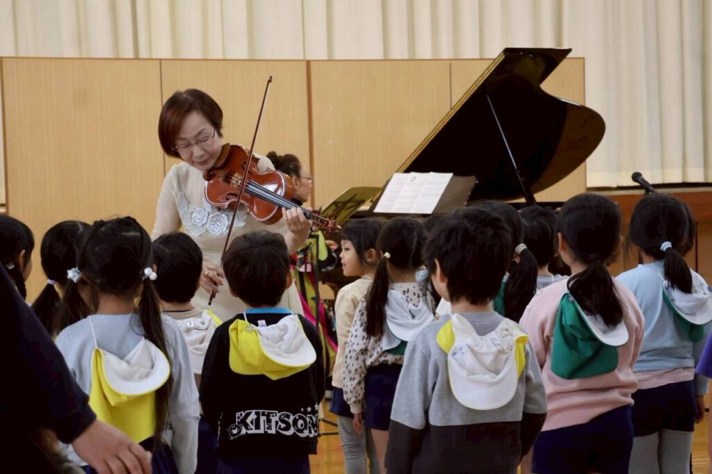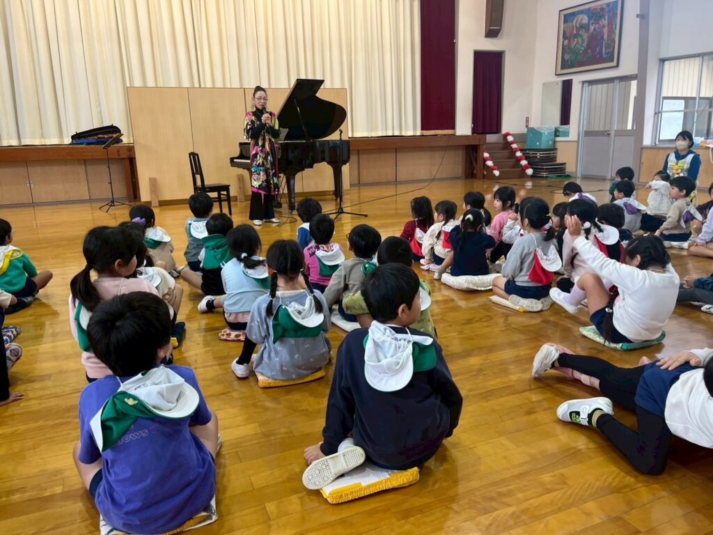 静かで穏やかな旋律が体育館に響きわたります。普段は元気いっぱいの子どもたちも自然と静かになり、真剣な表情で耳を傾けていました。