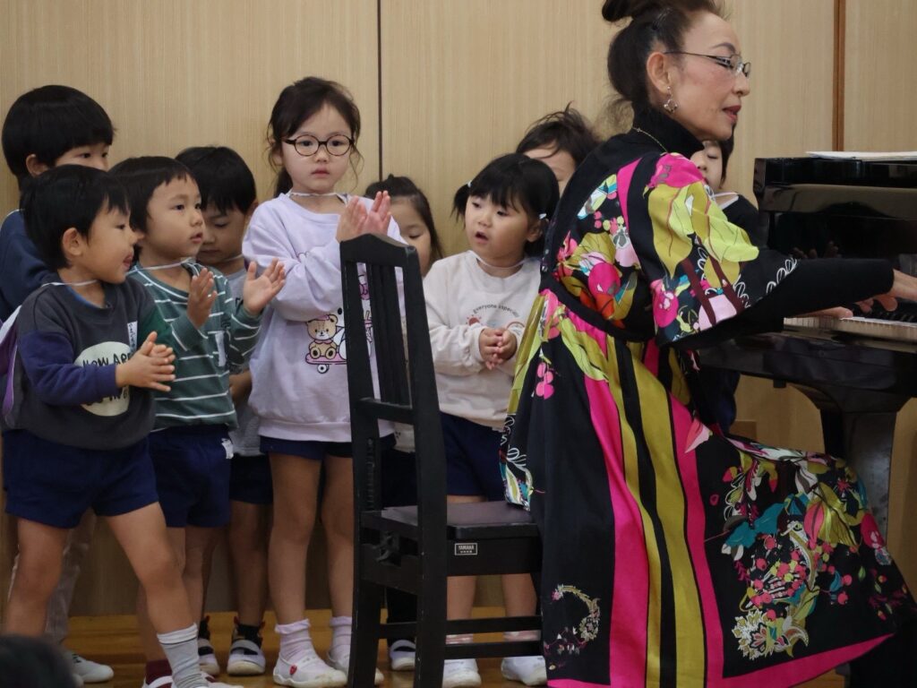 ピアノから少し離れた場所に座っていた年少さんは、ピアノのお隣に移動します。