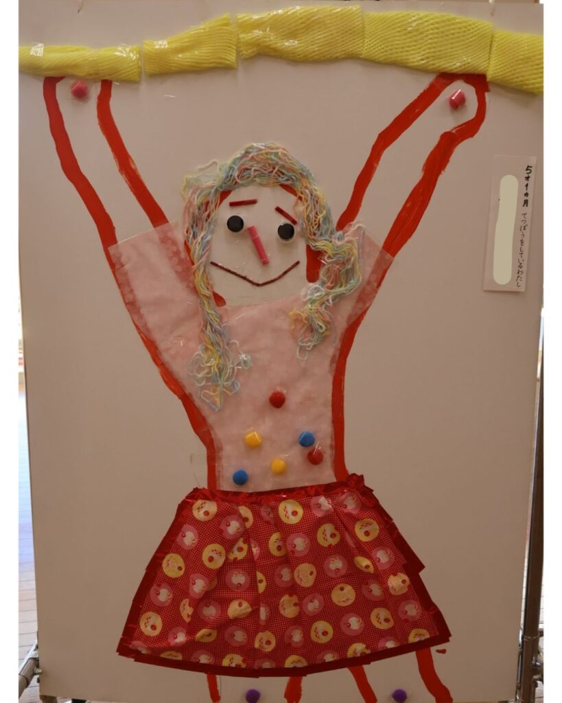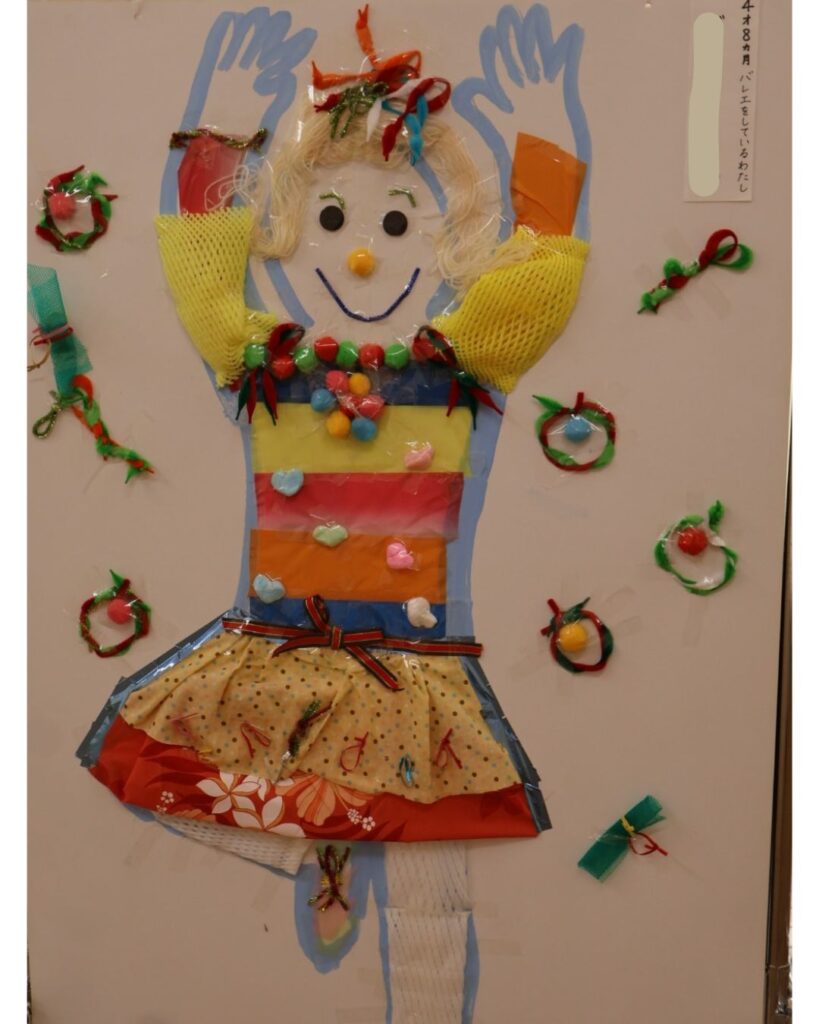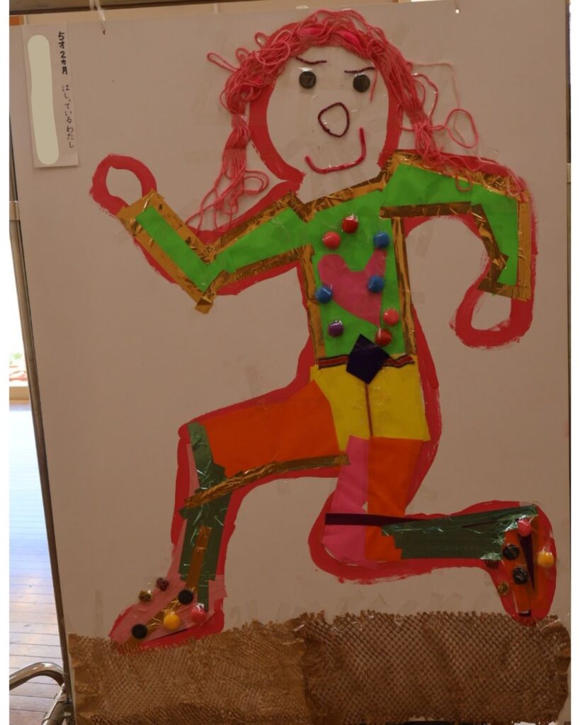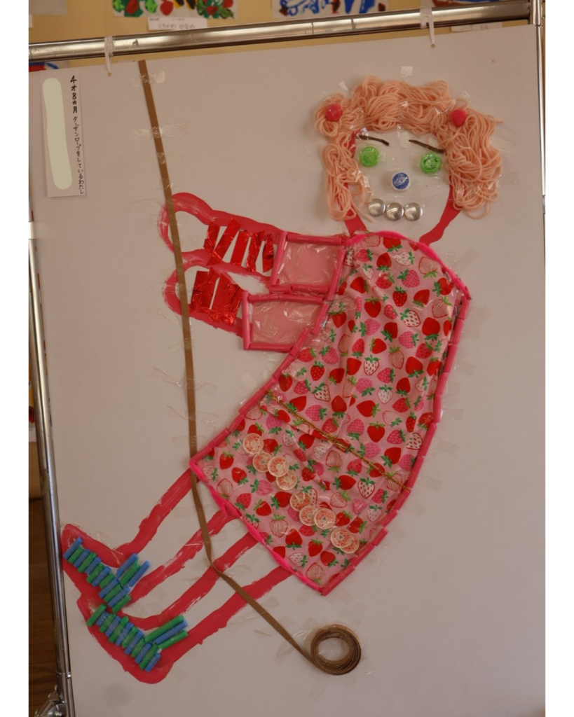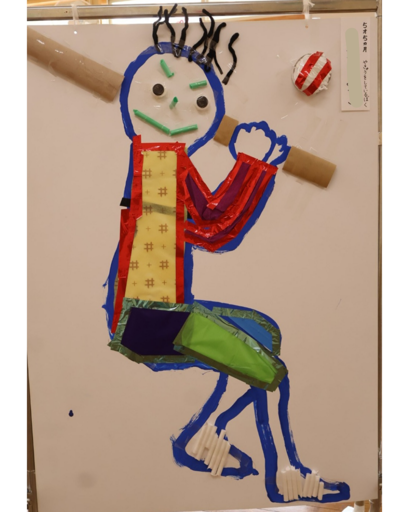 紙の上で子どもたちがポーズをして、先生が鉛筆で型を取り、子どもたちが絵の具でなぞったそうです。