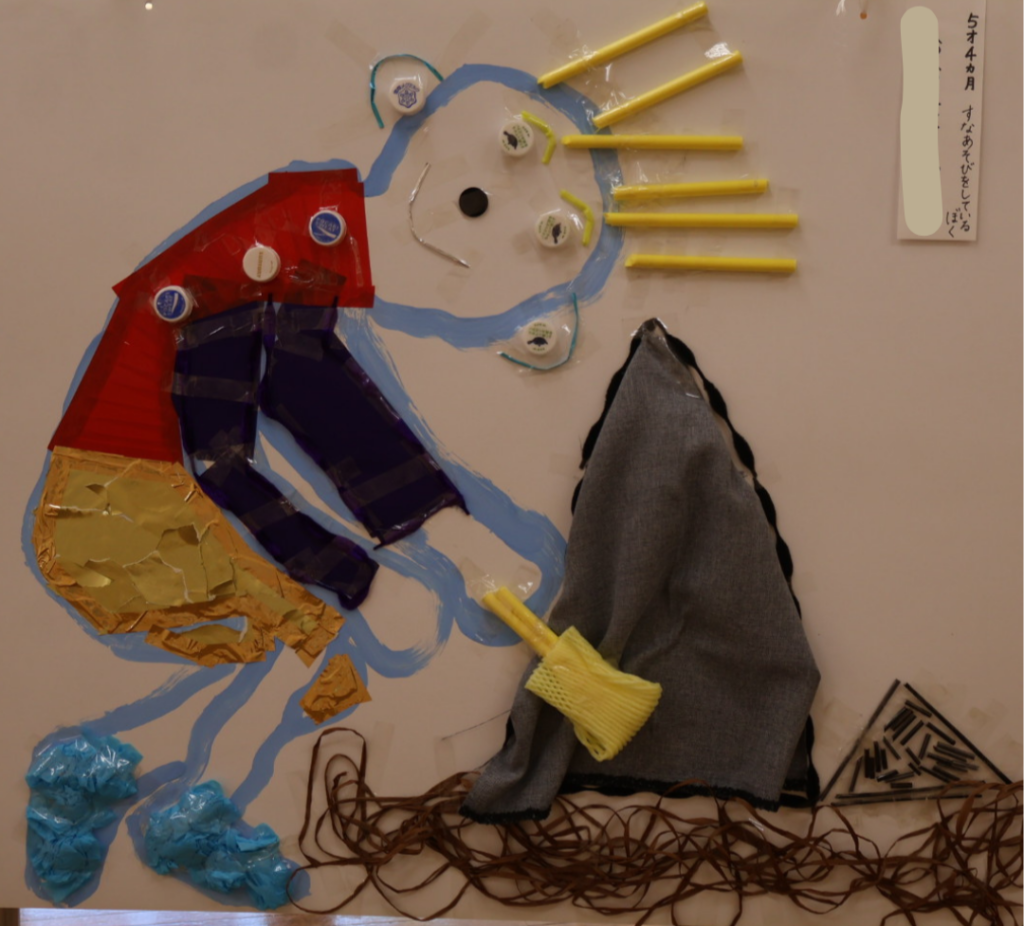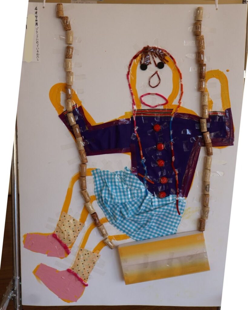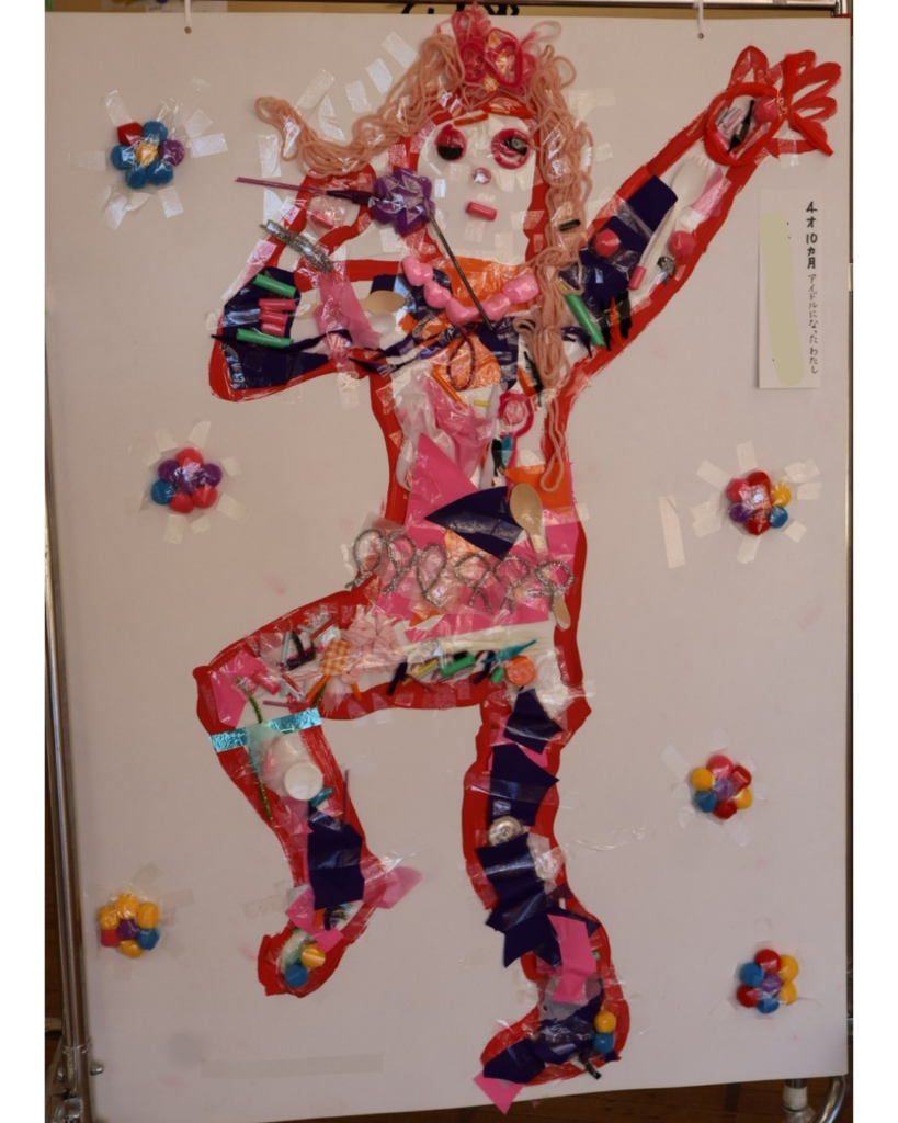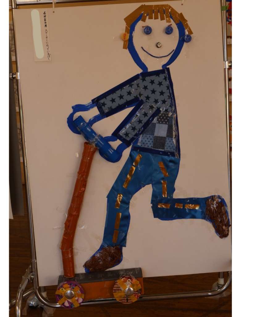 紙の上で子どもたちがポーズをして、先生が鉛筆で型を取り、子どもたちが絵の具でなぞったそうです。