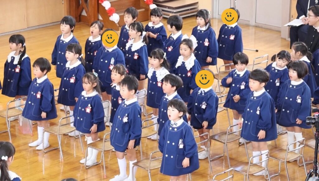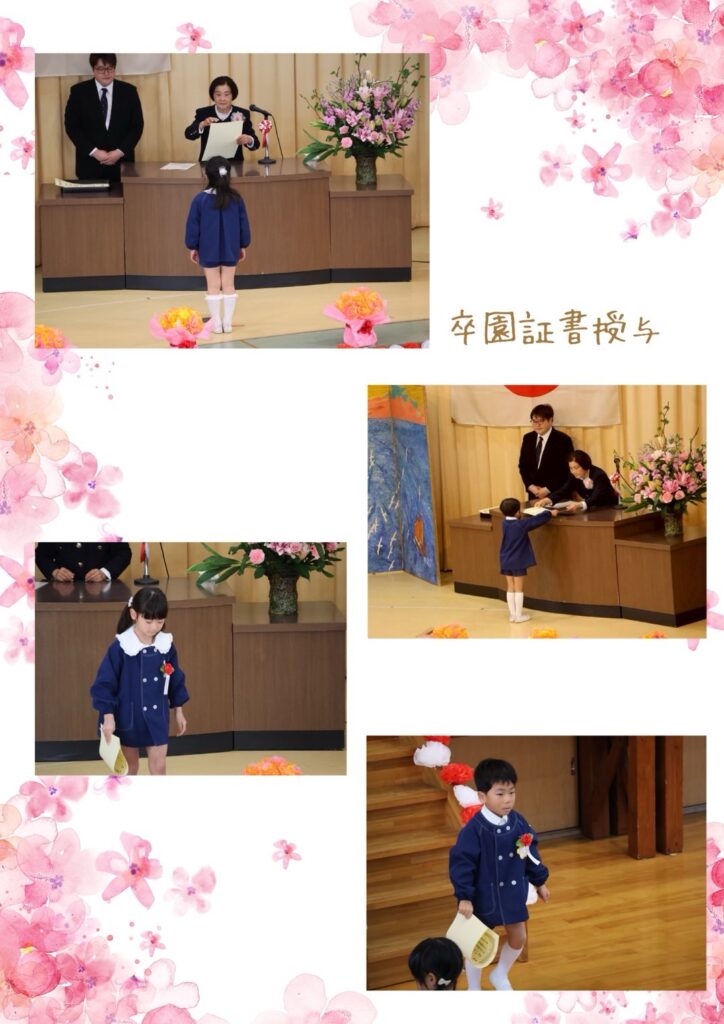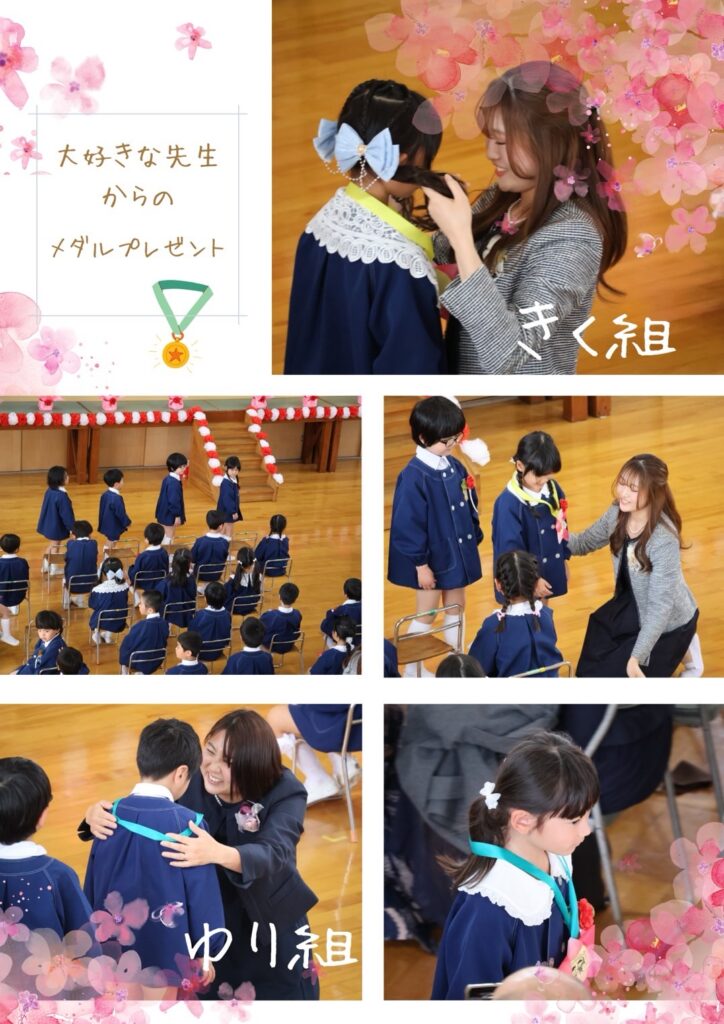 いよいよ、先生、幼稚園ともお別れの時です。担任の先生が子ども達一人ひとりに丁寧に優しく声をかけてくれます。私たちも、子ども達と過ごした日々を思い出しながらその様子を見守りました。